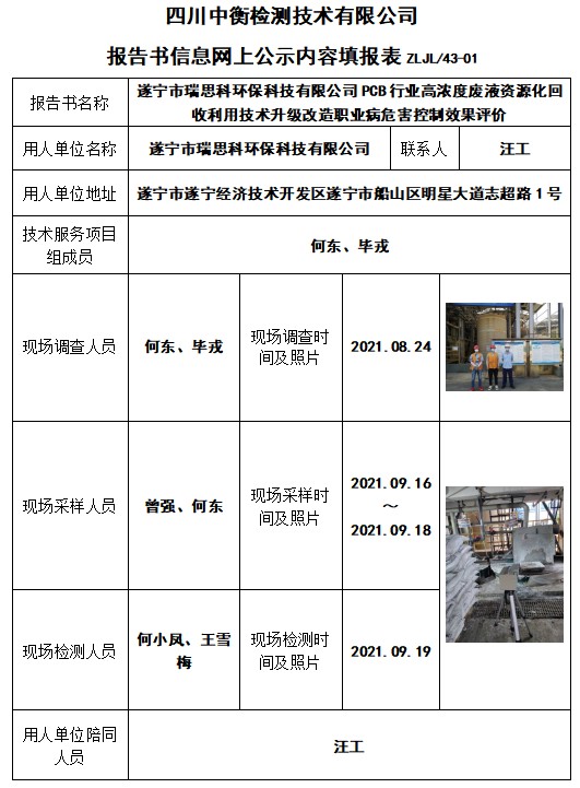 遂寧市瑞思科環(huán)??萍加邢薰綪CB行業(yè)高濃度廢液資源化回收利用技術(shù)升級改造職業(yè)病危害控制效果評價